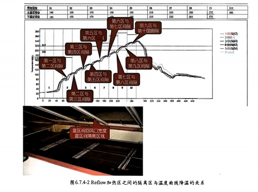 如图6.7.4-1温度曲线波浪状,不光滑, 客户、 领导经常会问及此问题,导 致业界同仁十分被动。 此现象的 本质是 Reflow加热区之间存在隔离区域, 如第一区与第二区之间存在回风口或隔离区,此区域没有热风吹出, 当产品本身内部温度低时, 被加热的产品表面温度升高, 无热风吹临产品表面时,产品内部的低温会吸收表面的 热能而导致表面温度降低, 呈现如图的温度曲线。 图 6.7.4-2 Rellow加热区之间的隔离区与温度曲线降温的关系。 此种波浪状是符合逻辑的合理存在,但每家炉子不同、 产品热容量不同体现结果会有差异,不需要特别处理。 如 果一定要表现平滑,可以通过测温软件优化 。