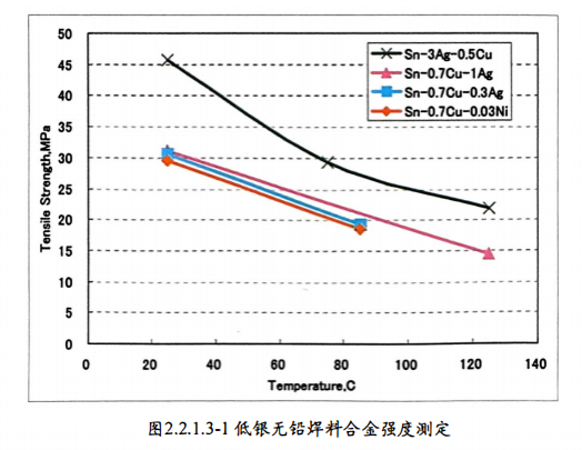 低银SAC三元合金焊料,常见的有SAC105、SAC0307两种,是业界为降低焊料成本而开发的替代合金配方。SAC105含银量1%±0.2%,含铜0.5%±0.1%,SAC0307含银0.3%±0.1%,含铜0.7%±0.1%。合金为非共晶焊料,熔点一般抓取227℃。SAC105、SAC0307合金通常不建议用于锡膏锡粉制作,可以用于波峰焊、选择焊锡条成份。(图2.2.1.3-1 低银无铅焊料合金强度测定 资料来源:日本焊接材料协会)