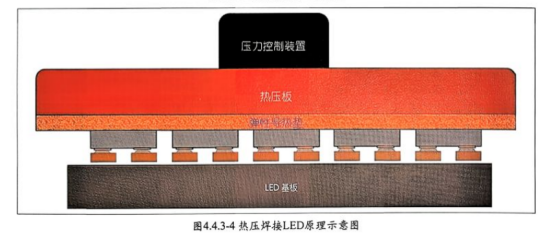 使用预上锡的 PCB, 喷涂粘着力高的助焊剂,再将LED准确放置在对应位置,合适压力热压使焊锡熔化,完成焊接,图4.4.3-4热压焊接LED。 此种方案焊接效率高,焊锡量均匀一致,焊接后LED高度一致且无偏位、倾斜现象出现。是 Mini LED与Micro-LED焊接的优秀方案。