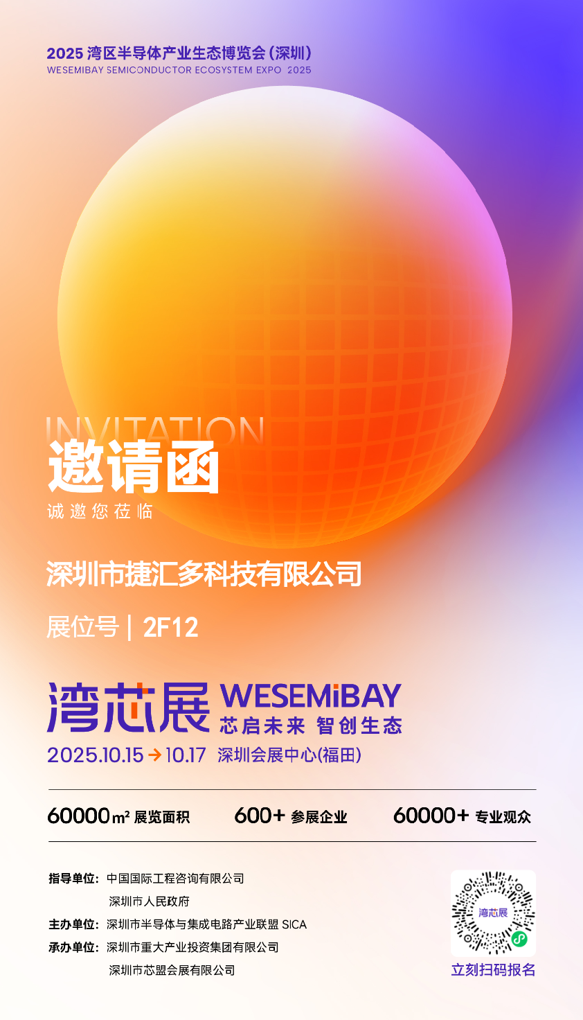 金秋十月,半导体行业盛会——2025湾区半导体产业生态博览会今日在深圳会展中心隆重启幕。捷汇多科技集团携旗下三大品牌盛装亮相2号馆2F12展位,首日便迎来参观热潮,现场交流氛围热烈,为为期三天的展会奠定了精彩开局。