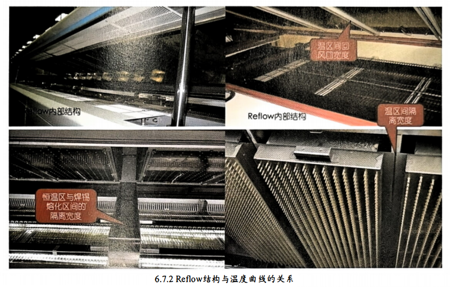 按照以上要求列印的温度曲线,前几个温区对应准确,后面温区位置无法对应,出现此现象的原因是每个温区的宽度设置不准确,如每个加热区宽度35cm,温区间回风口5cm,实际应设置的每温区宽度40cm,如人工实际测量温区宽度为5cm,则累计的宽度误差体现在后几个温区就是实际温区与温区规划不对应。有的Reflow 结构上均温区与熔锡区之间存在一个隔离带,此宽度同样会体现在温度曲线上,测温人员同样需考虑此物理宽度,否则也会导致温区与温度曲线无法对齐现象。图6.7.2 Reflow结构与温度曲线的关系。