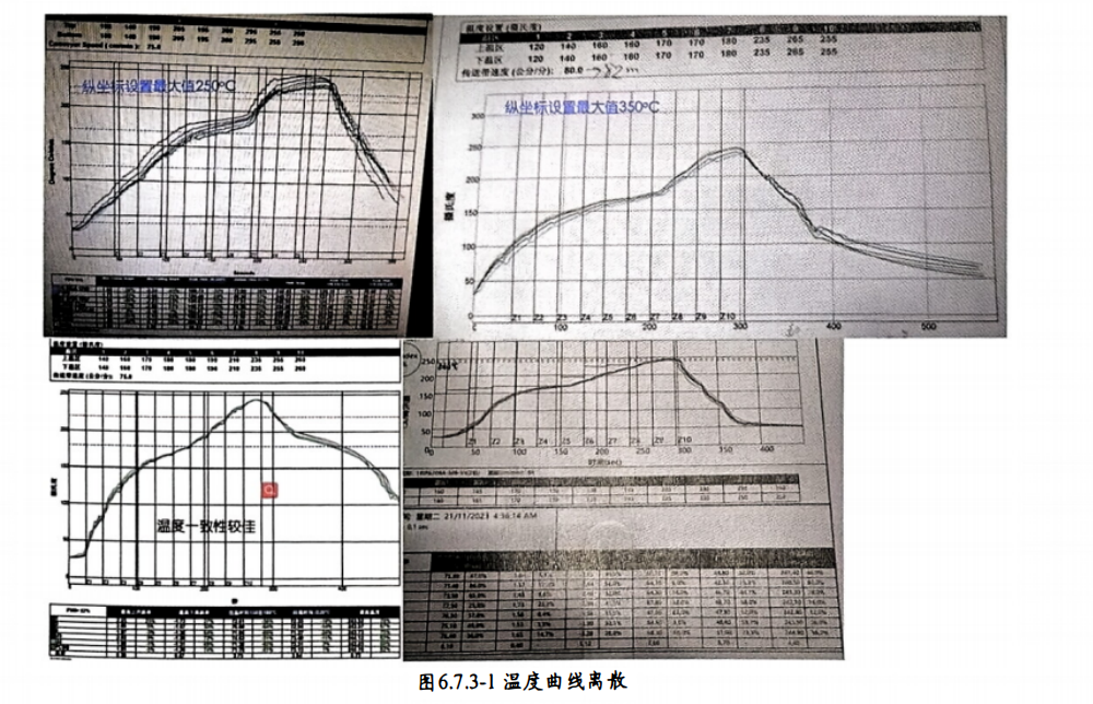某些温度曲线打印时发现,每 根测温线之间存在温差, 打印出来的温度曲线离散, 图6.7.3-1 温度曲线离散 。 导致此现象的本质是每根测温线体现的是不同元件的温度,元件类型不同、 热 容量不同、 测温线固定位置不同, 相同时间闻声不同,所 以每根温度曲线无法重合。 我们看温度曲线,本质是要看管制点温差数值,如 BGA最高温、QFN最高温、三极管最高温、表贴电容最高温,几种元件最高温差异多少度。业界为了让测得的温度曲线不表现出离散状,可以使用测温软件进行优化,也可以人为优化,如最高温设置为250°℃与350°℃,则温度纵坐标的单位长度内代表的温度差不同,最高温设置越大,温度曲线体现出被压的特征,反之则体现离散的特征。同一温度曲线本质相同,体现会有差异,业者要看本质,而不是看外观。