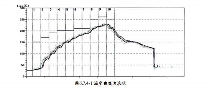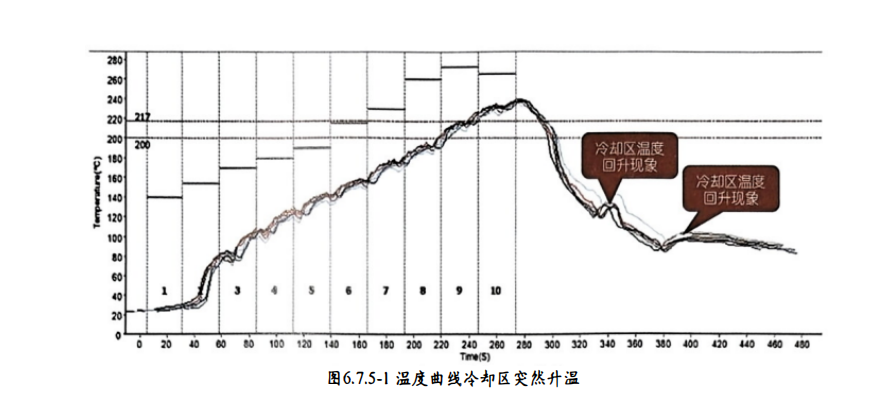 如图6.7.5-1 温 度曲线冷却区突然升温,该升温的原因是产品热容量较大,进入冷却区后冷风对产品快速降温,冷却区之间同样存在隔离区域或回风口, 此区域不会有冷风吹出, 大热容的产品内部热量向外散出,导致位 于表面的焊点温度升高。 该温度回升现象属于正常现象,常见于大热容产品,业者无需对此作特别处理,但要确 保产品出炉温度稳定。 不得将该温度回升区域作为小范围内最大冷却斜率的计算依据。