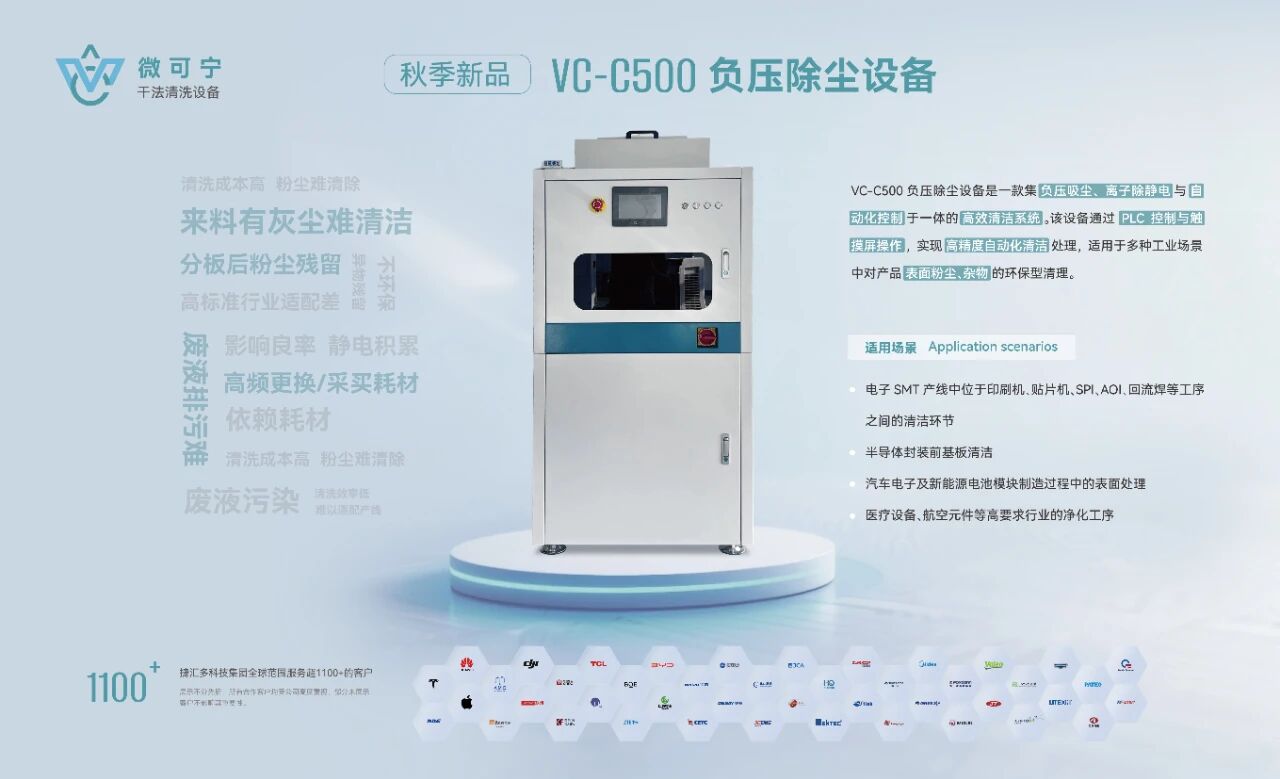 直面这一行业核心痛点,捷汇多科技旗下品牌 微可宁(VC Plasma) 以创新技术交出答卷:我们推出非接触式负压除尘设备,旨在以非接触、高效率、零耗材的干法清洗方案,重新定义精密清洁的标准。