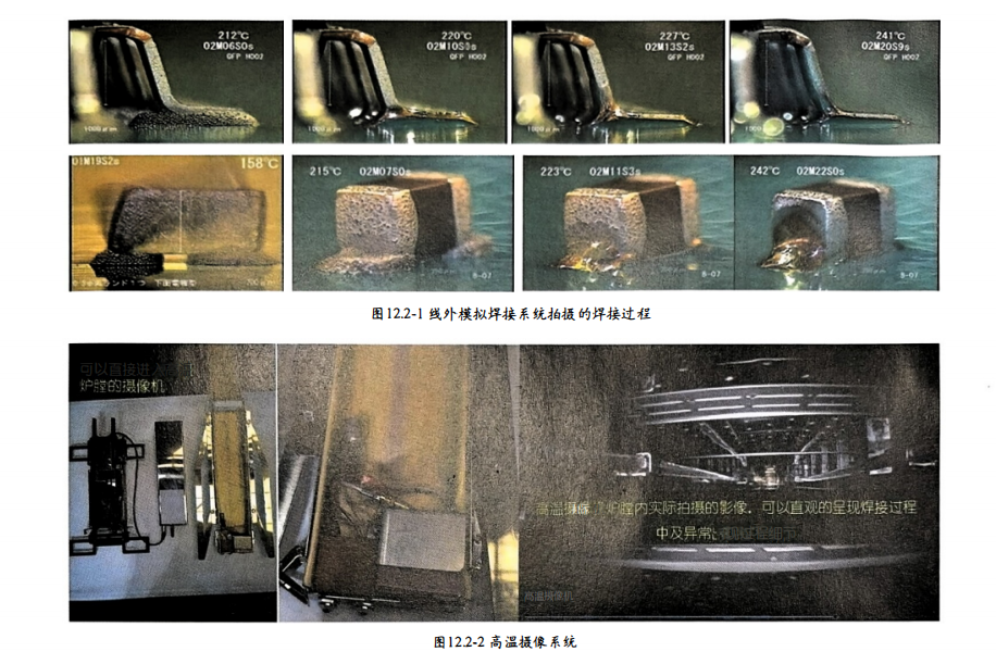 Reflow因过程不可直视, 产品进去到出炉中间过程无法直观监察,被业界称谓“黑匣子” 。 如果可以直观的 、实时观察产品在炉膛内的过程,立碑、 虚焊、 飞件、 偏移、 炸 锡、 吹锡、 锡珠、 飞丝短路、 焊 盘De-wetting、 灯芯效应、 漏 锡、 掉 件、浮高、HiP等 均可清晰呈现, 对于业者分析问题、 解决问题会有极大助益。 图12.2-1 线外 模拟焊接系统拍摄的焊接过程。 Reflow高温录像系统即是为此开发的产品,该系统高温录像部分可以跟随产品直 接进入Relow炉 膛内,实时采集影像,图 12.2-2高 温摄像系统。 记录产品焊接过程中焊锡变化,以便于业者观察分析。将原本黑匣子的过程直观的呈现在PCBA业者面前是行业同仁的心愿所在,对业者分析问题有直接的帮助。