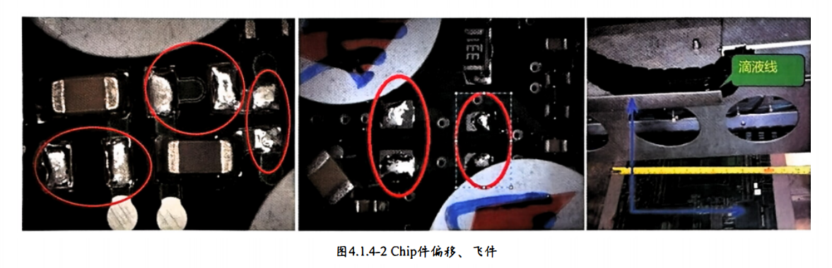 某产品使用汽相焊,炉后出现电容、 电阻移位、飞件不良,位置固定。 分析发现位置异常位置在推杆下方,图 4.1.4-2 Chip件偏移、飞 件。AOI 和人工检查确保炉前并无移位和飞料不良,确认是推杆上冷凝液体滴落所致,人工模拟发现滴液发生在熔融焊接阶段才能导致移位和飞料,受滴下溶液冲击而移位和飞料。将冷凝上盖做倾斜改善,将冷凝液导流到炉子边缘流会炉膛使用,调整位置将推杆勾刀偏移不滴到电阻电容,定期将残留在推杆上的冷凝液体用风枪吹落到炉内。没有冷凝液滴落、 Chip件偏移、飞件现象消失 。