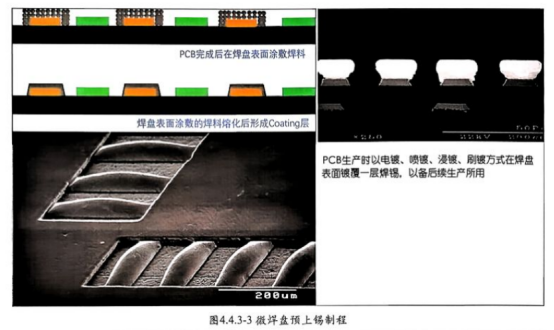 如此焊接工艺已经有很大挑战 , Micro-LED密度再增加其焊接难度可想而知。 业 界为解决此问题开发出了预上锡、热 压焊接制程。 当PCB焊盘密度逐渐升高 , pad Pitch<0.15mm时,传统锡膏印刷技术变得极为困难 ,如钢板开孔为( 60μm×60um, 钢板厚度30μm, 开孔面积比为:( 60μm×60μm/4×60μm×30um)=0.5, 锡 膏脱膜十分困难。尽 管锡膏粒径可以选择如8号粉、 9号粉,但依然难以保持印刷锡膏量一致性。 同时 ,锡 粉粒径越小,锡粉含氧量越高,越不利于焊接。业界为此开发出PCB焊盘预上锡工艺,图4.4.3-3微焊盘预上锡制程。