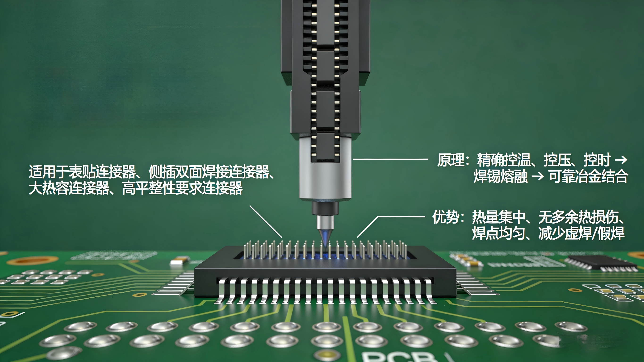 热压焊接在连接器焊接中,其核心原理是通过精确控制加热头的温度、压力以及焊接时间,使连接器引脚与焊盘之间的焊锡(或其他焊接材料)达到熔融状态并形成可靠的冶金结合。对于表面贴装的连接器而言,当采用热压焊接时,加热头会直接作用于连接器的特定焊接区域,确保热量集中传递,避免对连接器本体或周边元器件造成不必要的热损伤。