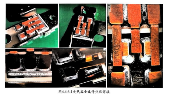 电子产品生产装配过程中,部分金属部件焊接及大热容部件焊接困难,超大的热容量需求让焊接装备难以快速提供充分的热量以满足焊接。提高焊接温度或拉长焊接时间不适合实际生产需求,有时受限于产品上其它部件不耐热,无法以拉高焊接温度、延长焊接时间完成生产。热压焊接成为优秀的供选方案。图4.4.6-1大热容金属件热压焊接。该方案使用时可以确保焊接平整度。被焊接基板可以使用预上锡机制作业或使用焊锡预制片作业(Preform),甚者可以采用高温焊接材料完成焊接以提高焊点可靠性。